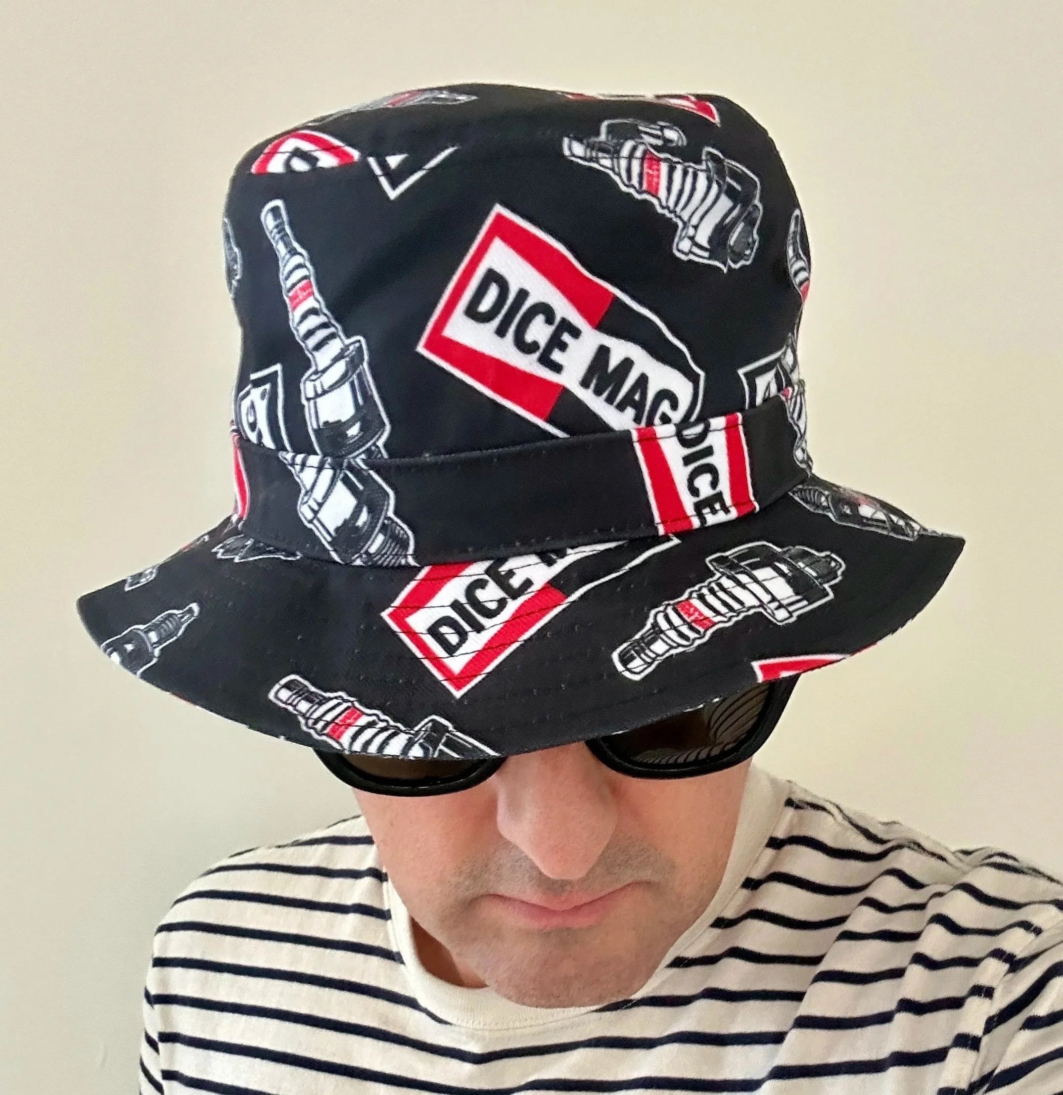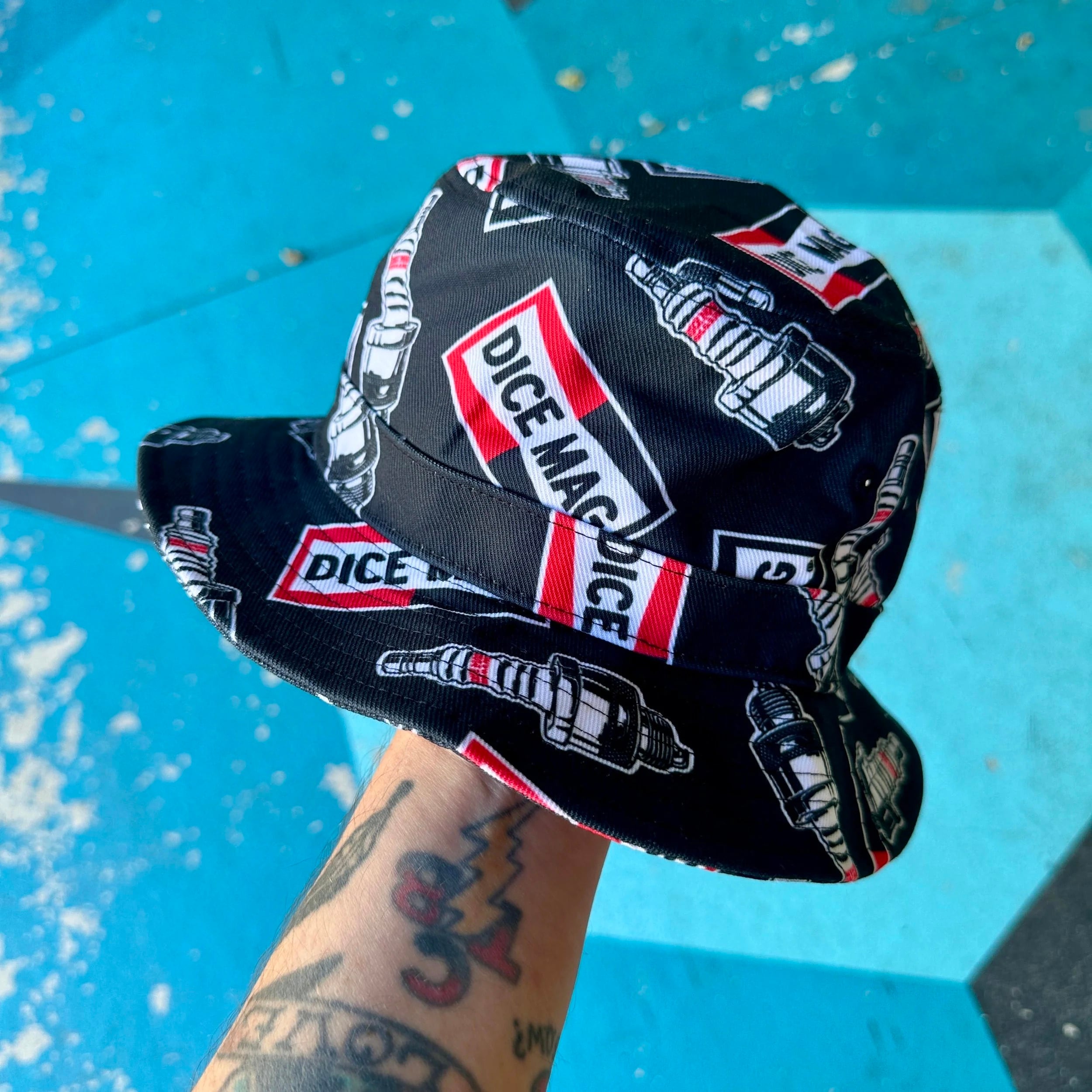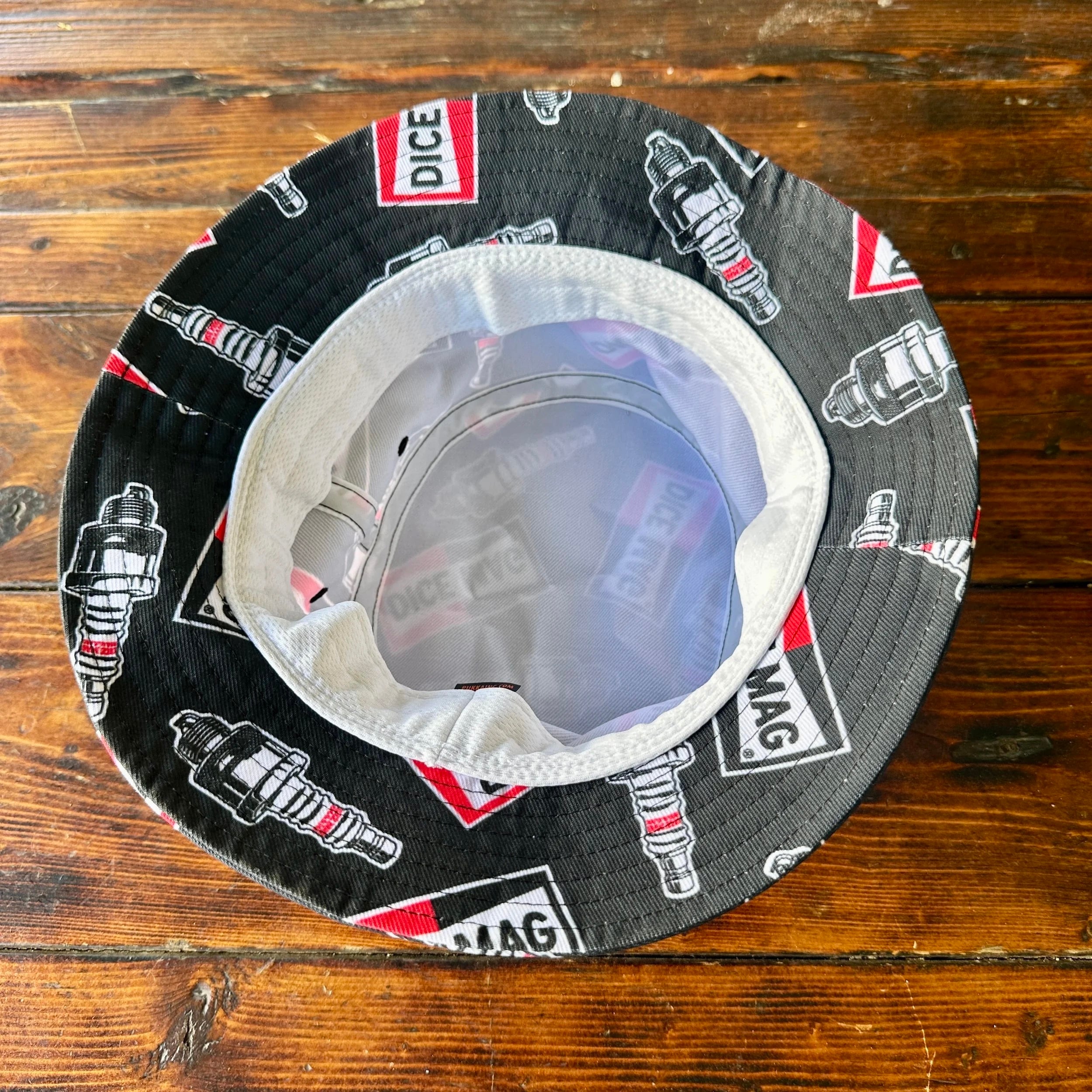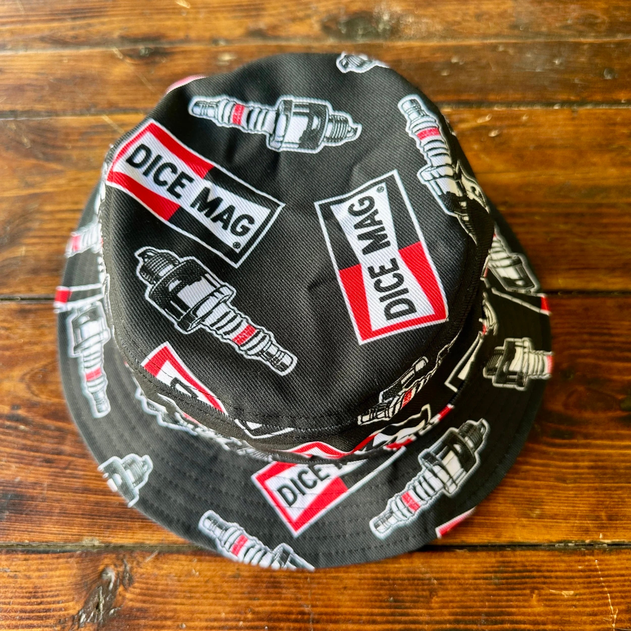 チャンピオンスパークプラグのビンテージファブリックを模したダイスロゴグラフィクのオールオーバープリント。