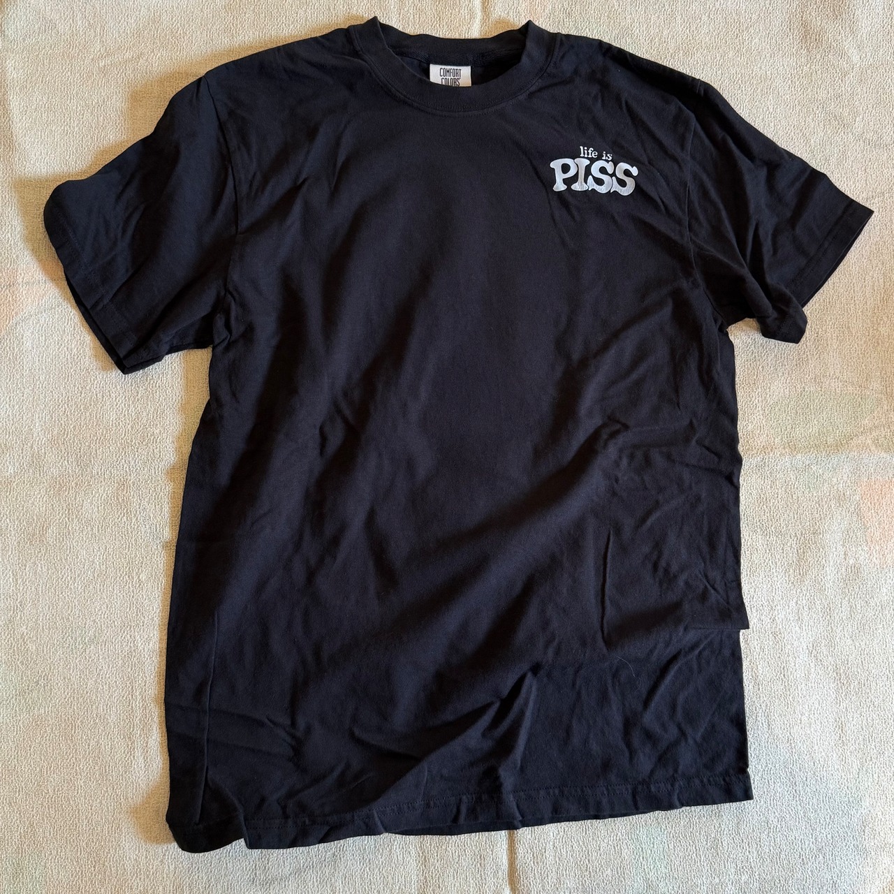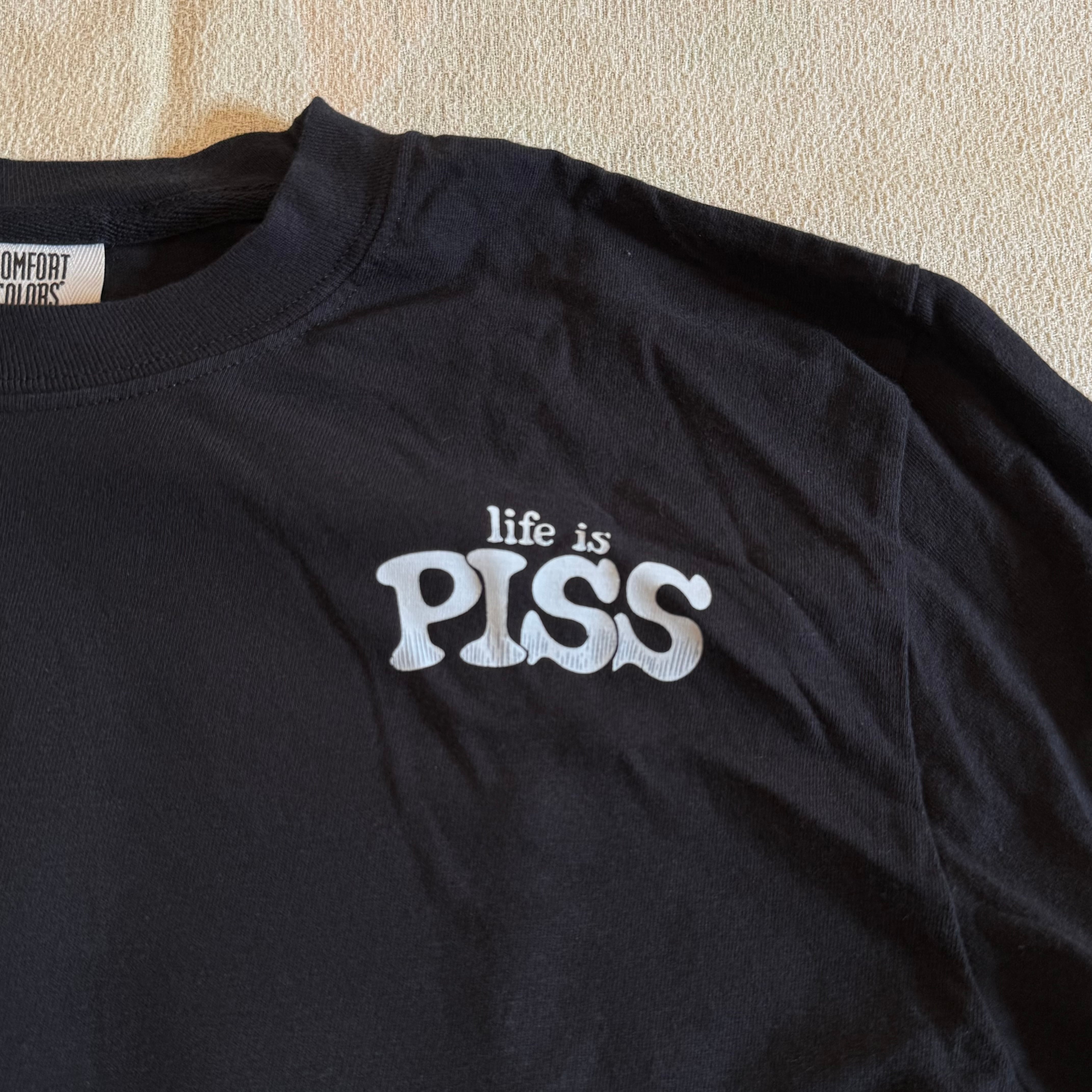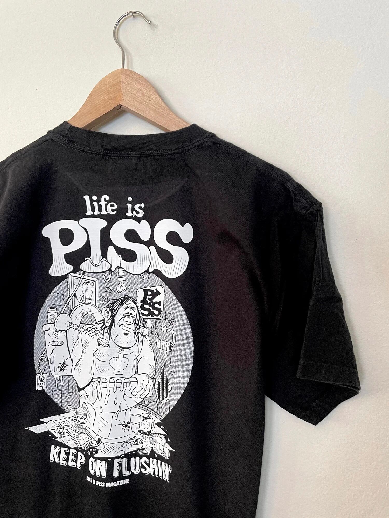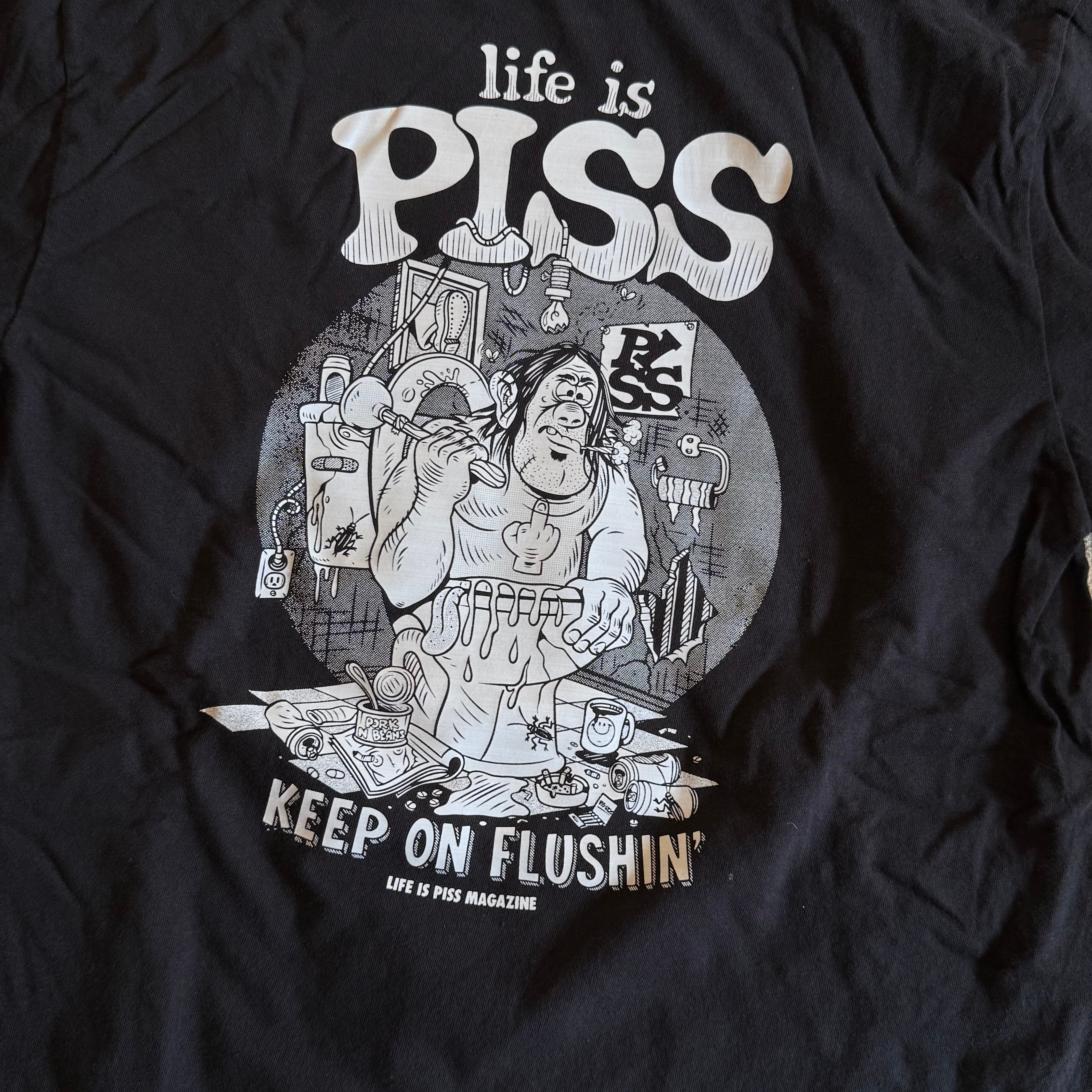 Life is PISS“Keep on Flushin” shirt! Our first collab shirt featuring artwork by the one and only Burrito Breath.