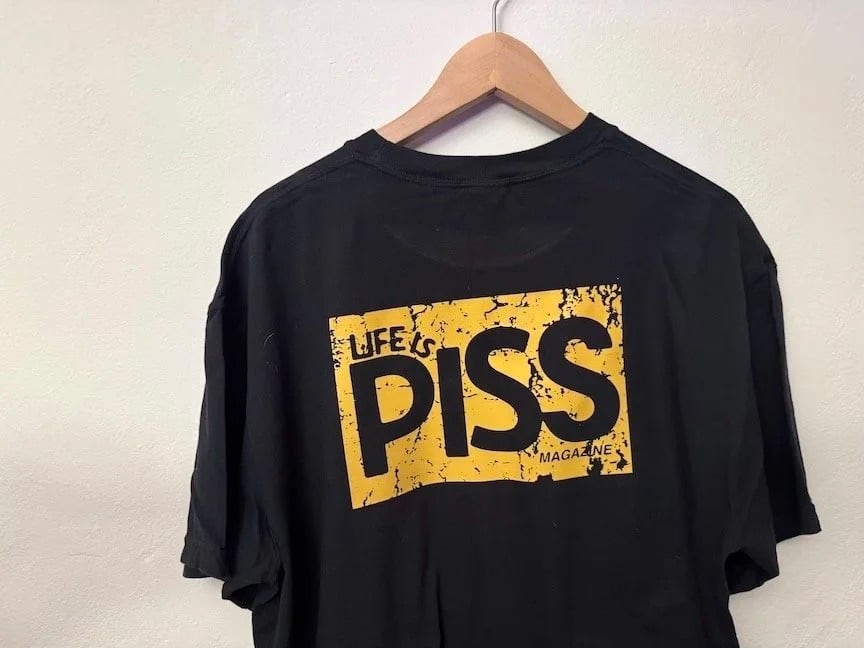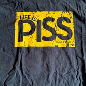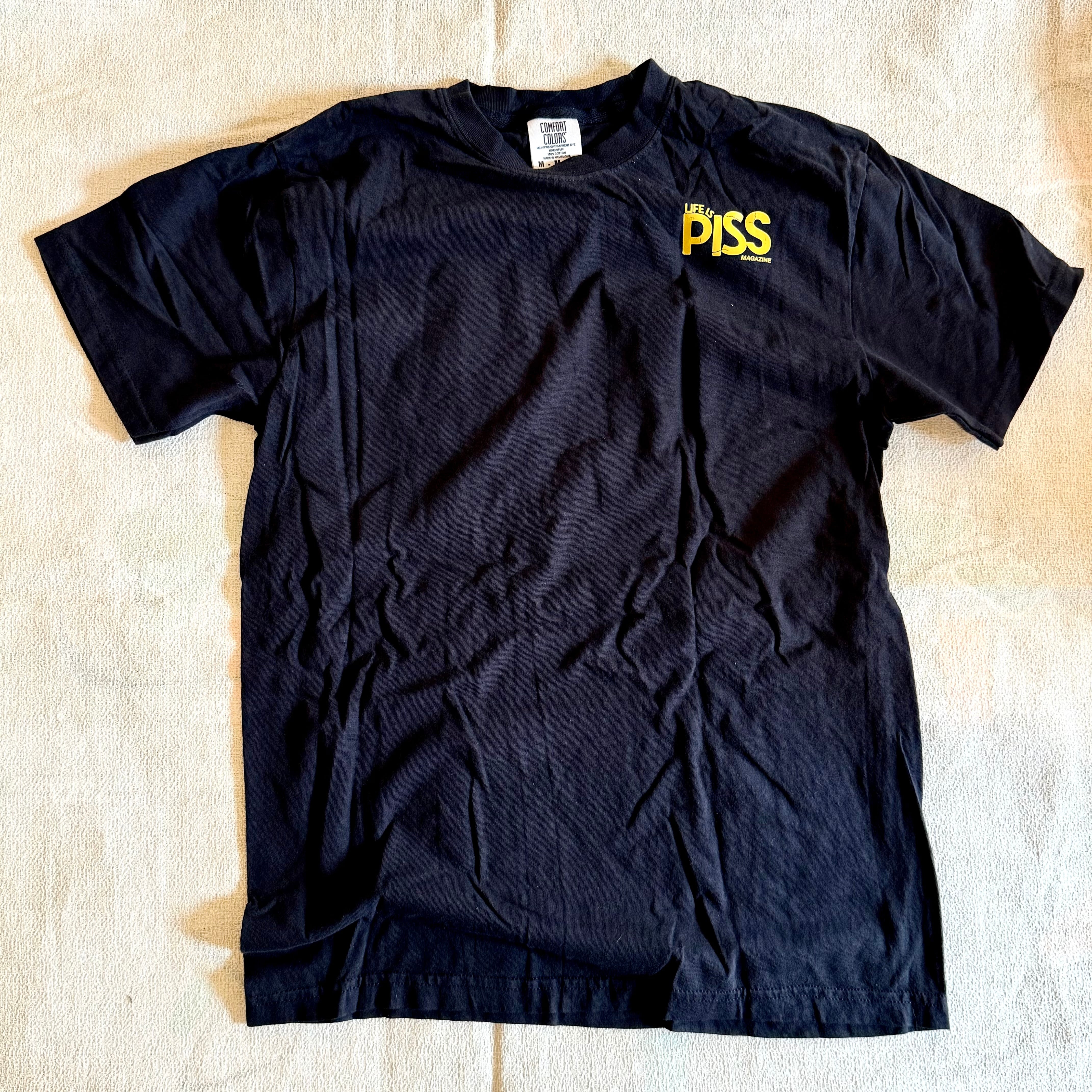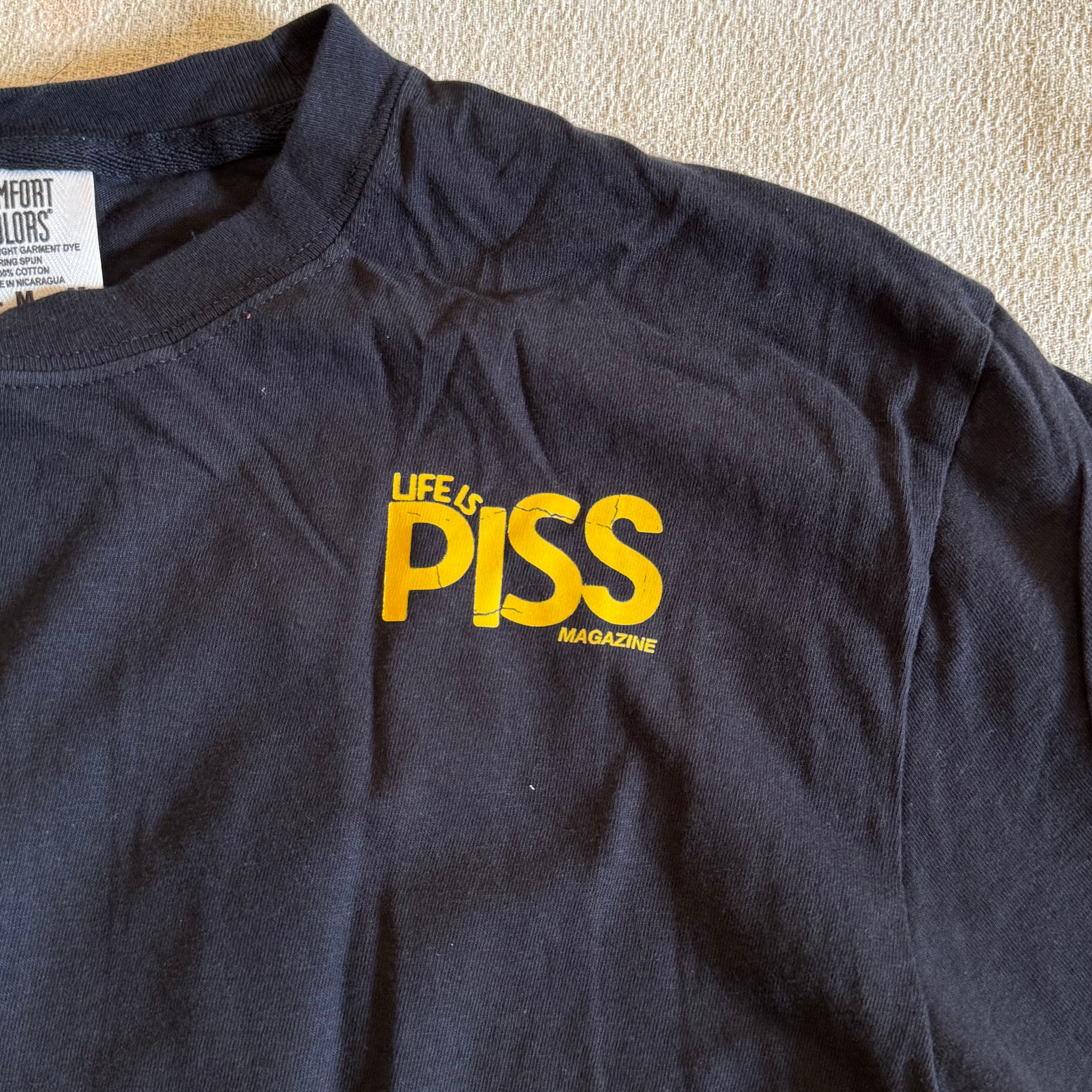 order your original Life is PISS “Shop Tee” shirt today! Artwork features a small logo on front and a large cracked logo on the back. All shirts are printed by us on Comfort Color shirts.